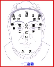 四.天庭司空之側。日月角也。次則輔角。又次則邊城。邊城在眉尾高骨斜上入鬢。皆邊城也。共七個部位。而而勻分之方確。不論額之寬窄。而移動也。