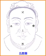 額為火星。得其炎露之氣則貴。低陷狹窄則貧苦而賤。鼻為土星。宜圓隆得其厚重之氣則富。小露缺沖則貧苦反覆。口為水星。宜厚仰硃