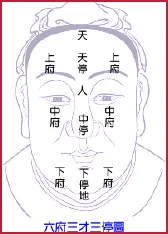 二.髮際之下為天中。其次為南岳。又名火星。又其次為天庭。又其次為司空。又其次為中正。中正一名華蓋。而氣色部位。則以華蓋包括司空中正兩部。兩眉之中。方為印堂。印堂者。君位也。此為全面部之主。由天中至印堂。共六個部位。勿論高低。勻分六部可也。