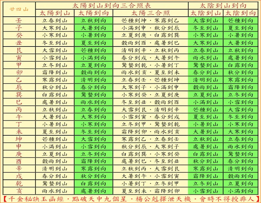 然太陽到向為上吉,到三合方為次吉,到坐山又次之。到向則太陽光輝直照,取欣欣向榮之象。到三合方則以光輝拱我,但到坐山只有帝王修造宮殿為宜,平民得之反招不利,恐難承受其至尊性質。