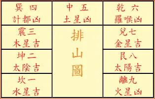 又如月朔日(初一日)即屬「卯日」,則看其天干屬陰抑屬陽(乙卯,辛卯屬陰;丁卯,己卯,癸卯屬陽。)陽順陰逆入排山圖,在坎一起數(此乃變格,不可在震三起數),看到何日飛到艮八宮,即是太陽值日。飛到坤二宮,則為太陰值日,太陽值日上吉,太陰值日次吉。(金星水星木星值日亦可用)。
