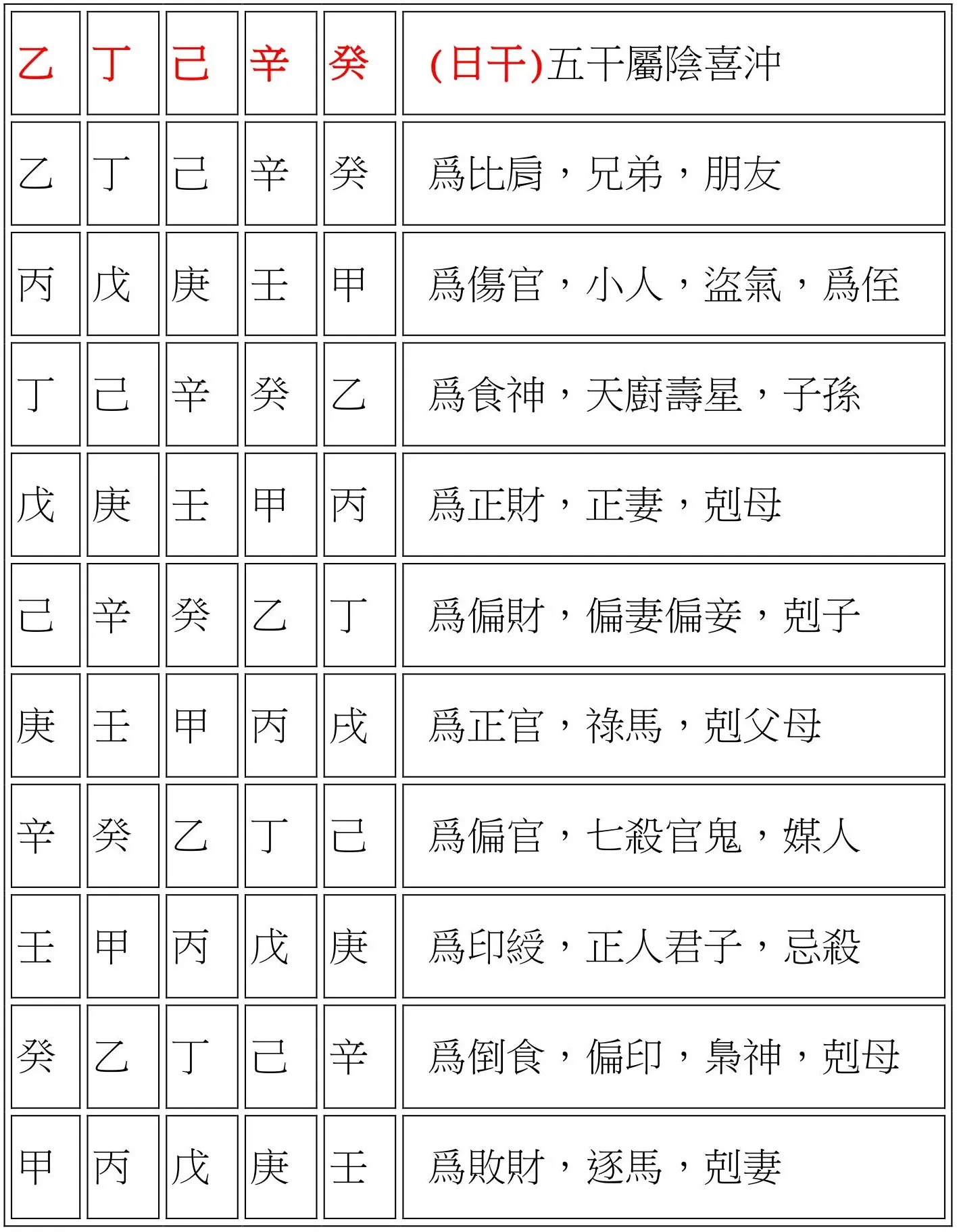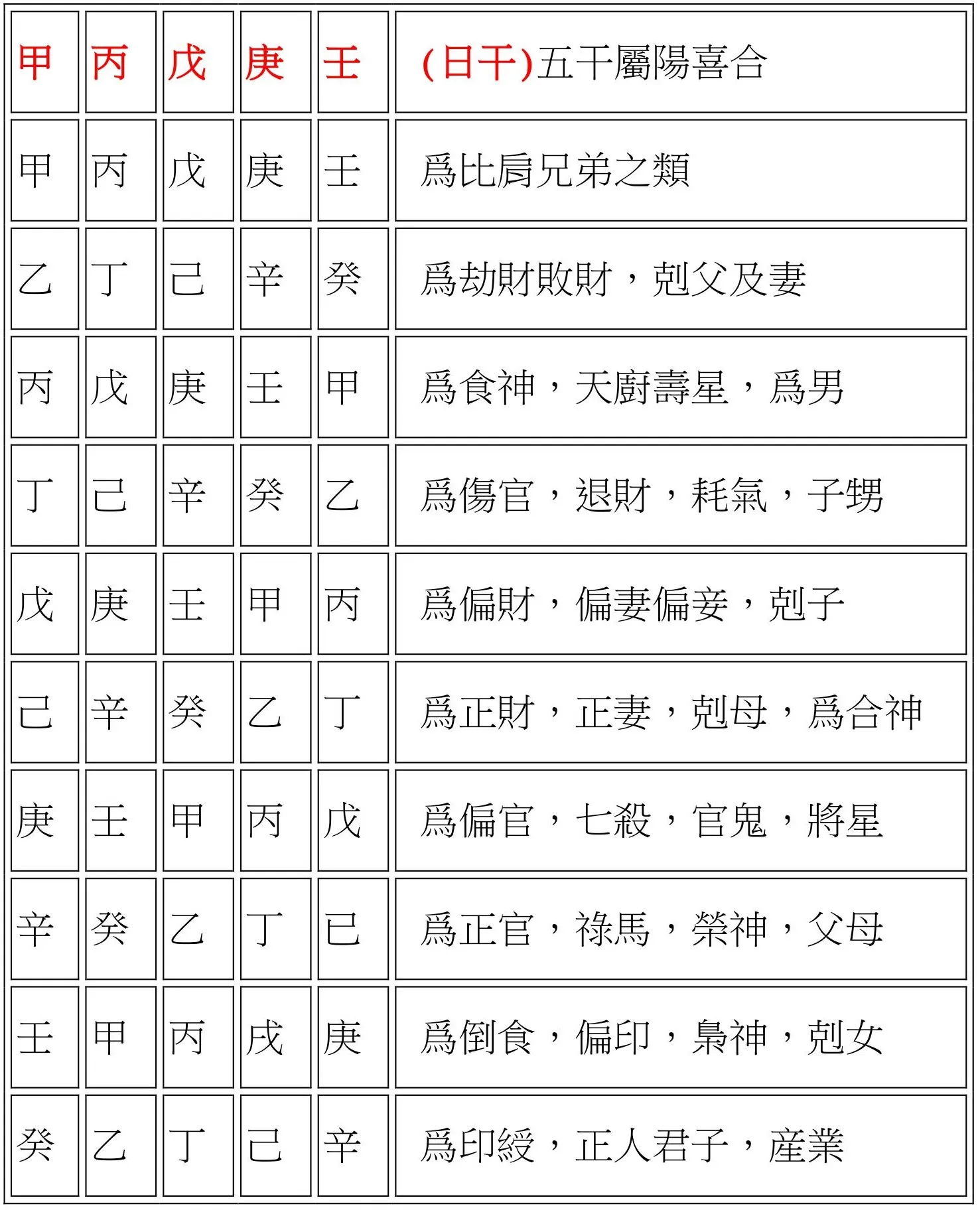 甲與己合(甲屬木,己屬土,木以土爲妻財,所以得合),乙與庚合,丙與辛合,丁與壬合,戊與癸合(同上相剋之意)。