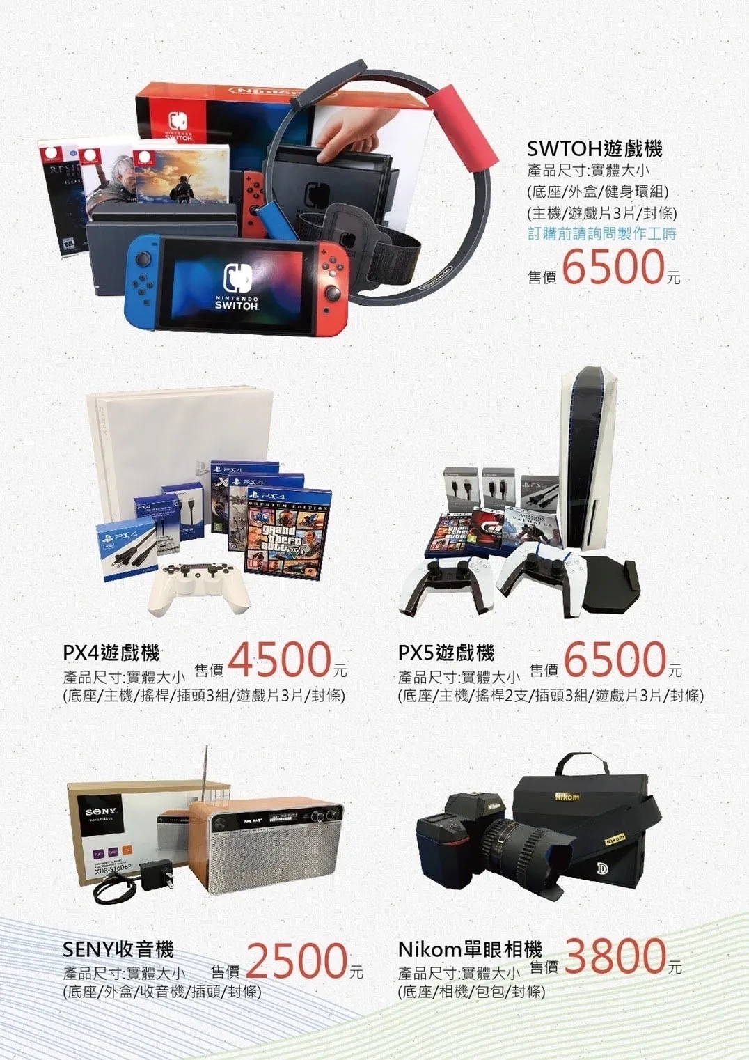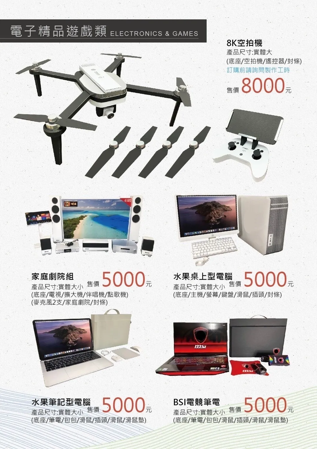 8K空拍機, 家庭劇院組, 水果桌上型電腦, 水果筆記型電腦, BSI電競筆電, SWTOH遊戲機, PX4遊戲機, PX5遊戲機, SENY收音機, Nikom單眼相機